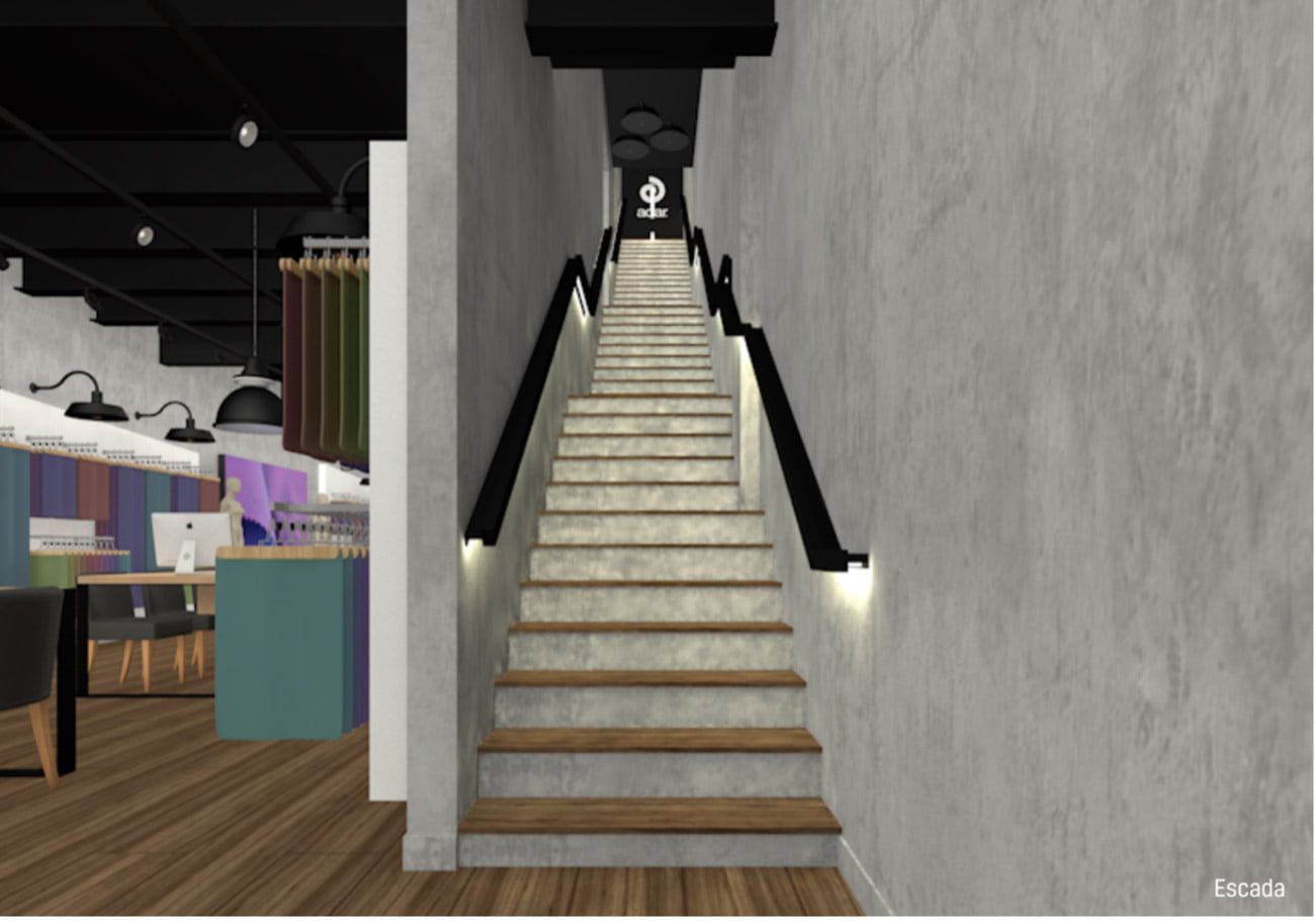 Visitamos o espaço e levantamos as medidas. Após algumas reuniões de briefing partimos para o projeto criativo. Tínhamos o objetivo de criar um espaço com aspecto industrial, aconchegante para os clientes, com boas experiência de consumo, tecnologia e com uma nova exposição de tecidos.