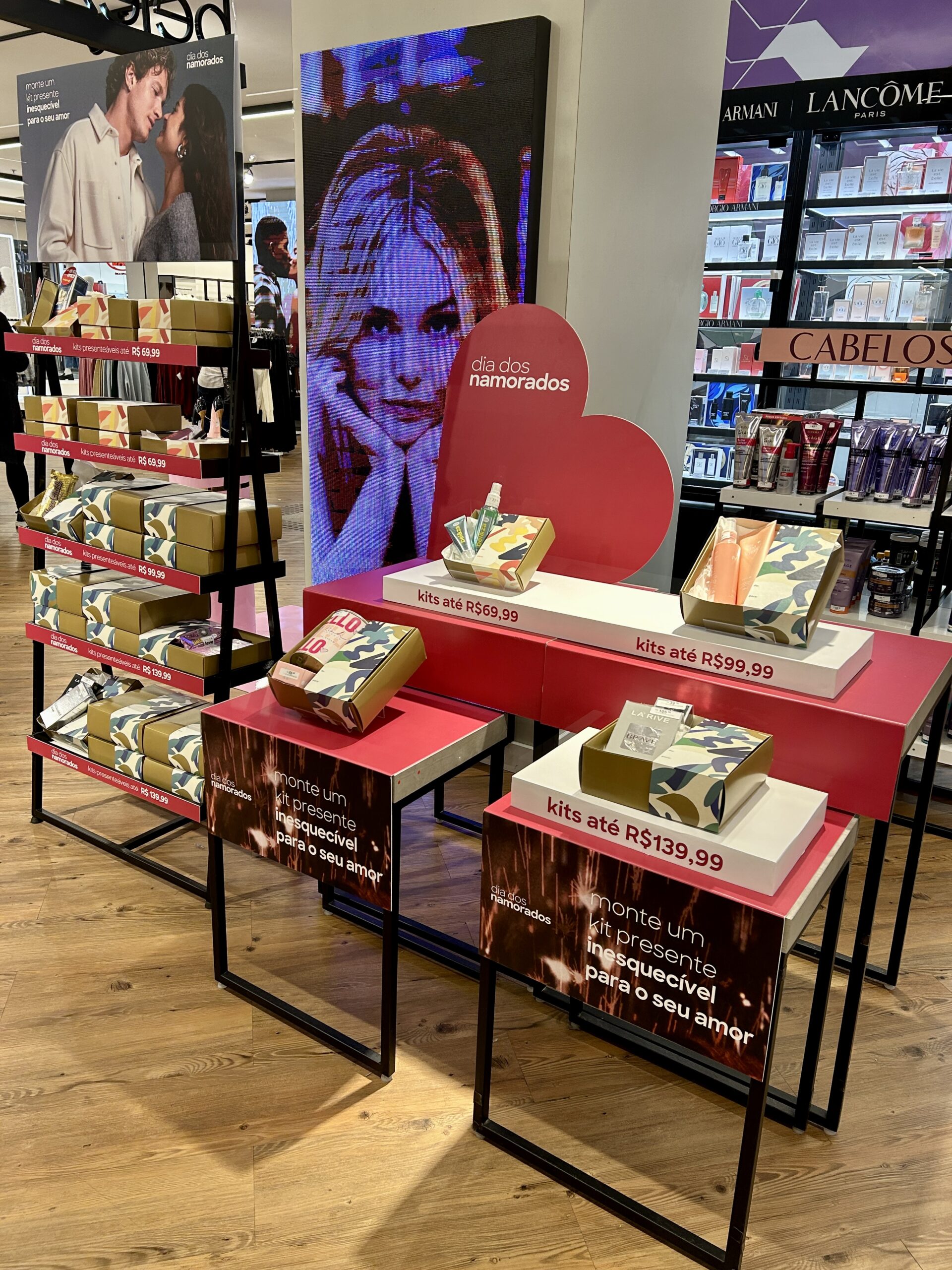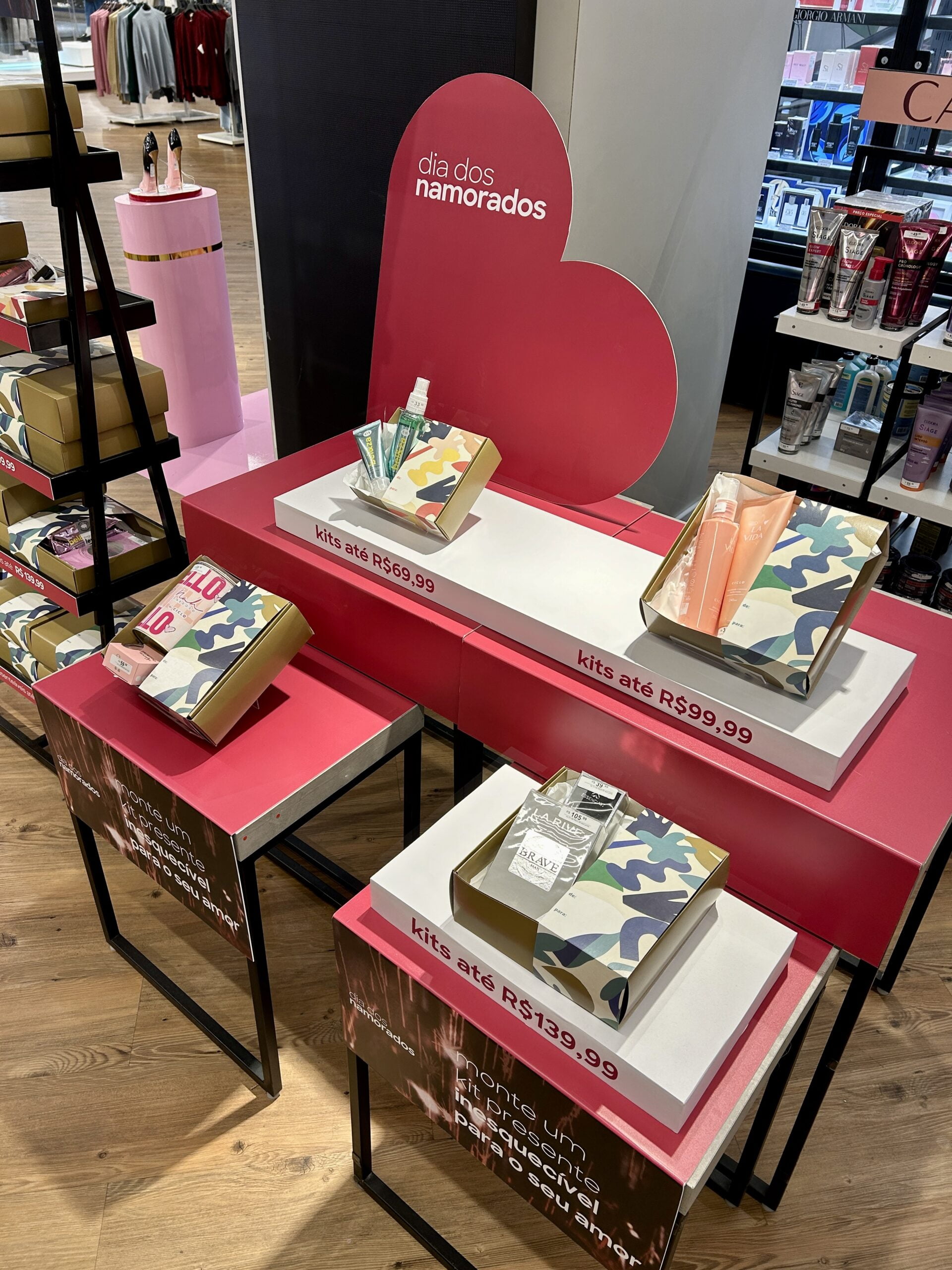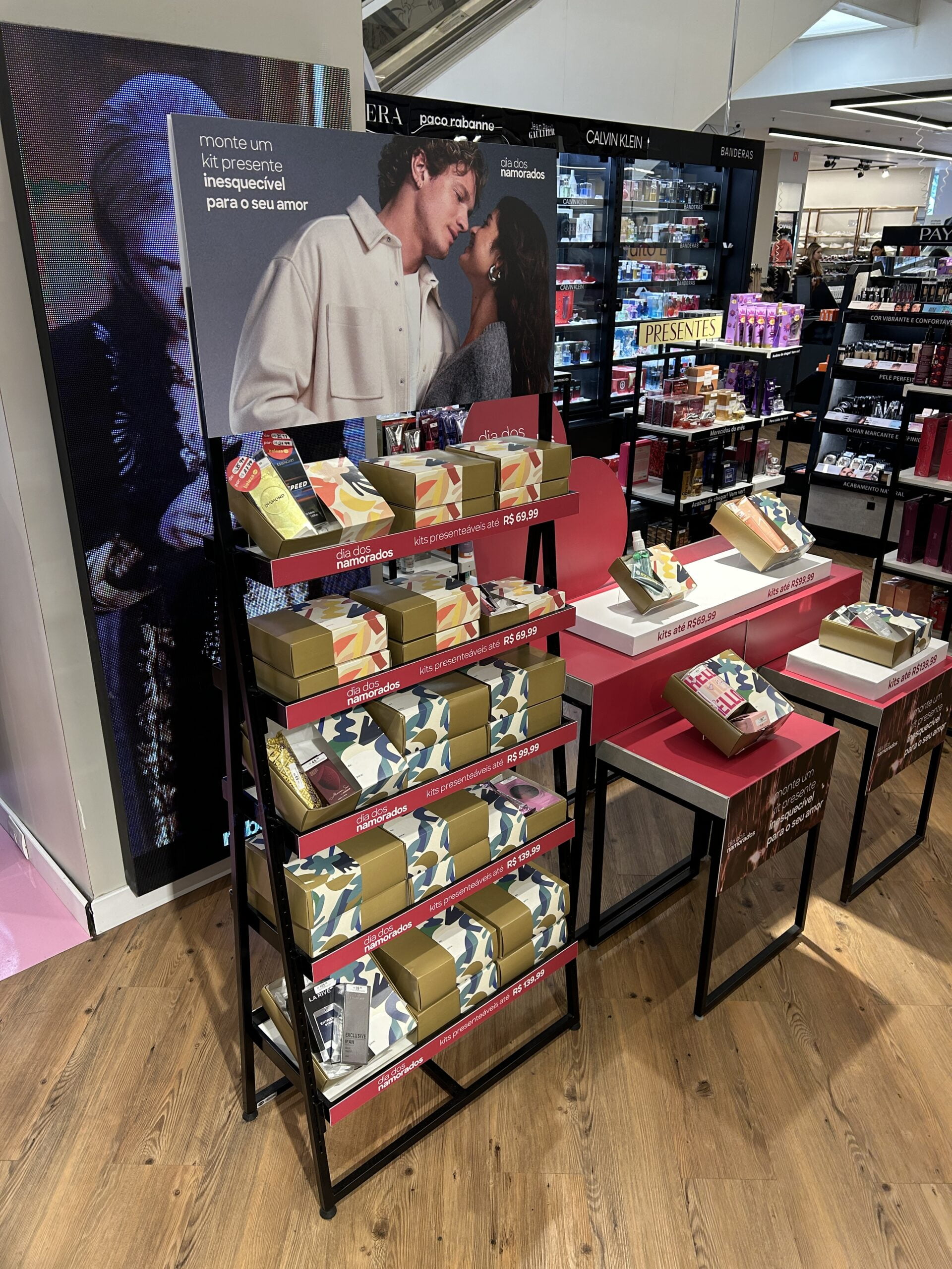 Para o espaço de beleza da C&A, desenvolvemos uma iniciativa especial para o Dia dos Namorados, com foco em aprimorar a apresentação dos kits presenteáveis, tanto das marcas parceiras quanto dos kits exclusivos da C&A. Atuamos na criação da campanha, na gestão da produção e na execução prática do VM (visual merchandising) de todo o projeto.
