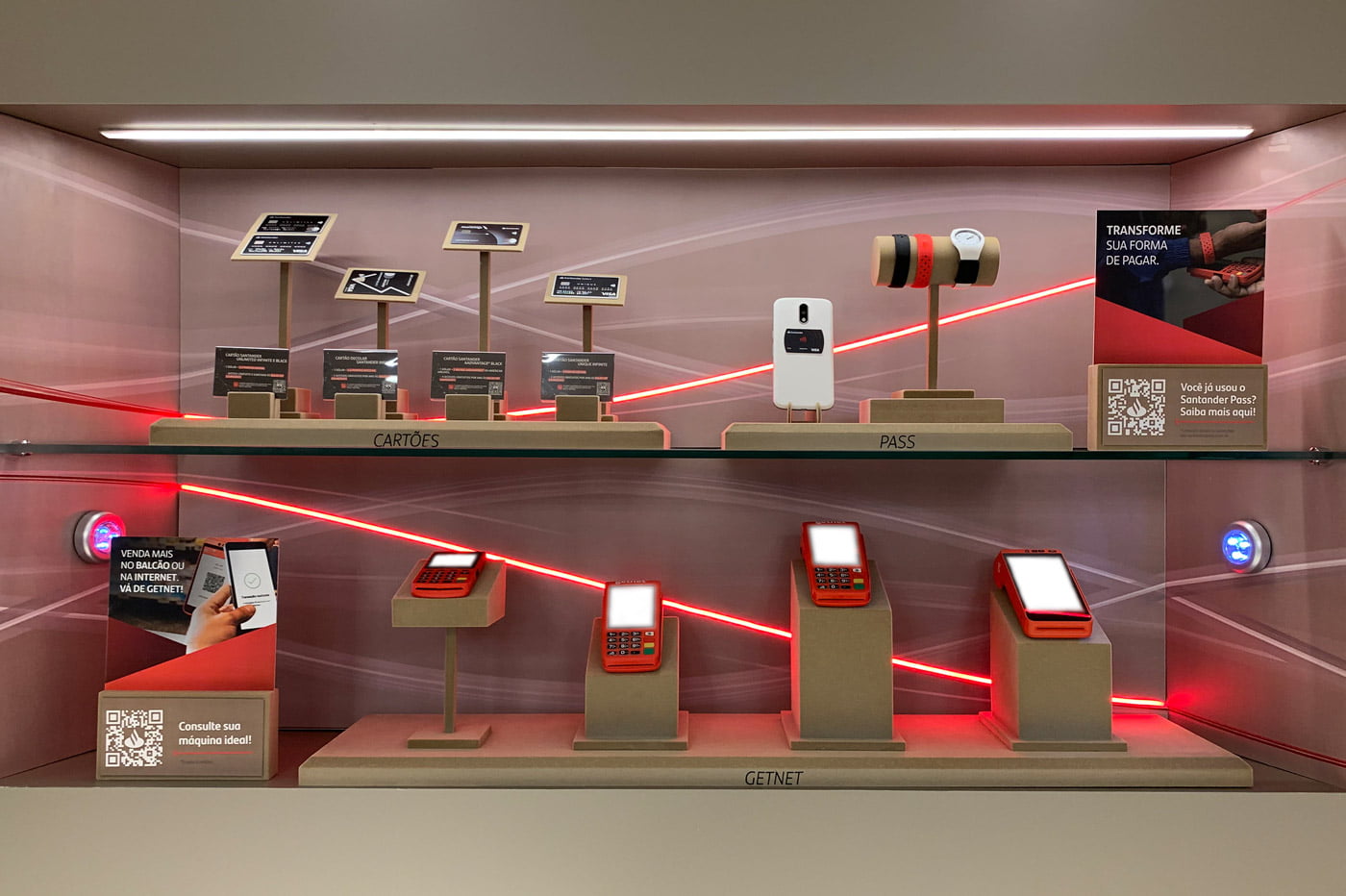 Fomos procurados pelo Santander para desenvolver um projeto para evoluir a apresentação dos produtos do banco. Criamos o conceito, o projeto executivo, gerenciamos a produção e fizemos a execução com o nosso time especialista em visual merchandising. Um case de sucesso, já que está sendo replicado em todas as agências Select do Santander no Brasil.